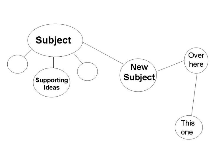 Try to capture the first subject out of their mouth in one word and circle it. Then as they build supporting thoughts for that subject, draw lines to additional circled words underneath or around the original word. If they begin to mention a subject that is not related, draw a long line to another space on the board and capture that subject in a word. Then draw the supporting thoughts of that new subject in a similar manner with closer lines and circle words. Something like this.